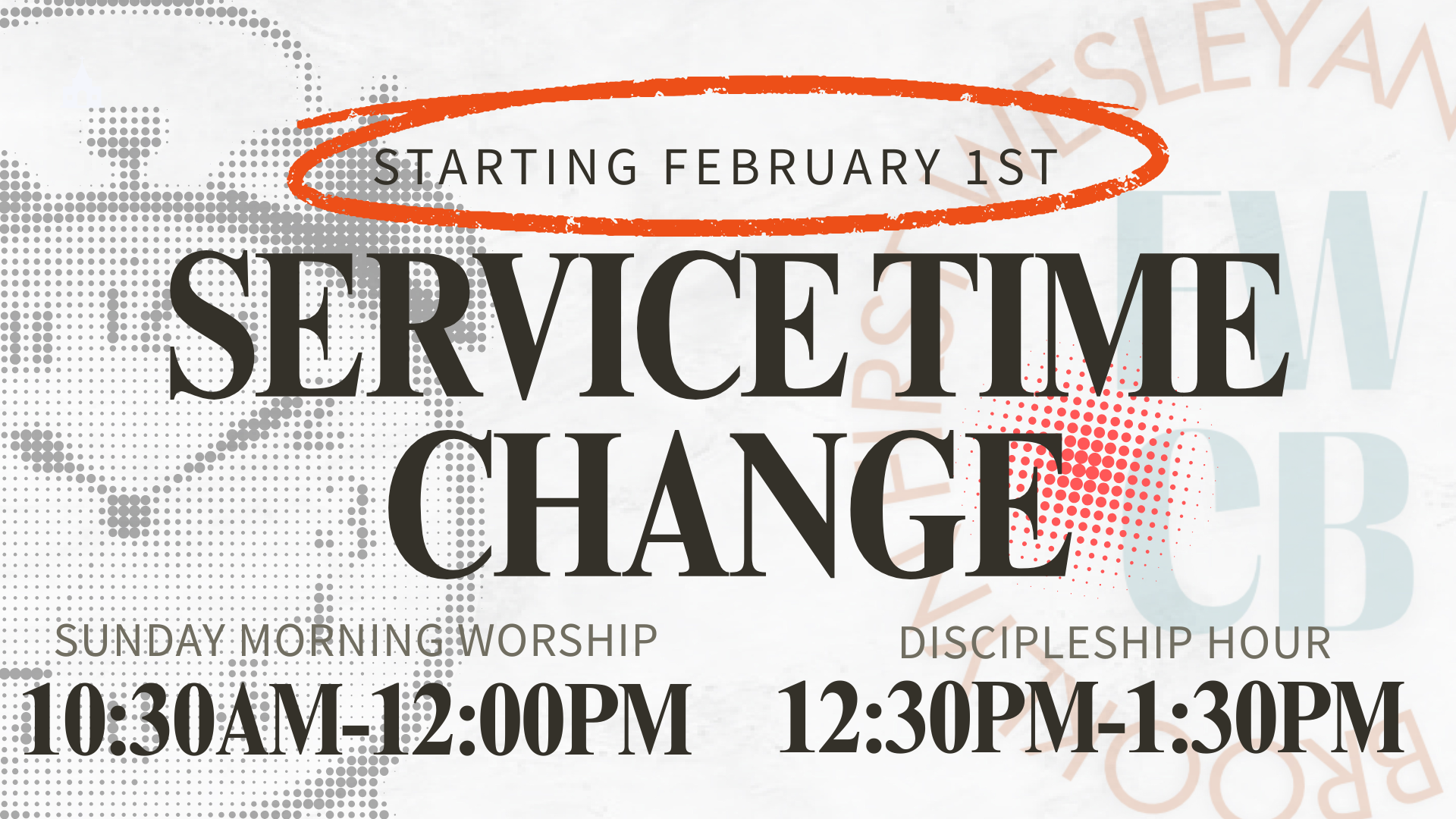 The Sunday Morning Service start time will now be 10:30 AM to accommodate a new Discipleship Hour starting at 12:30 PM