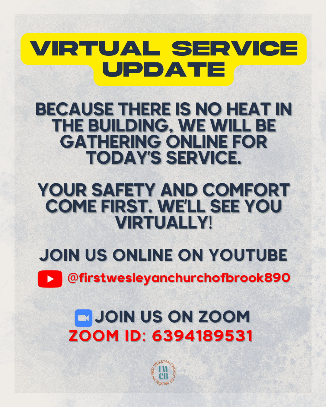 Unfortunately, due to a heating problem in the building, we will be gathering online for service on February 1st, 2026.